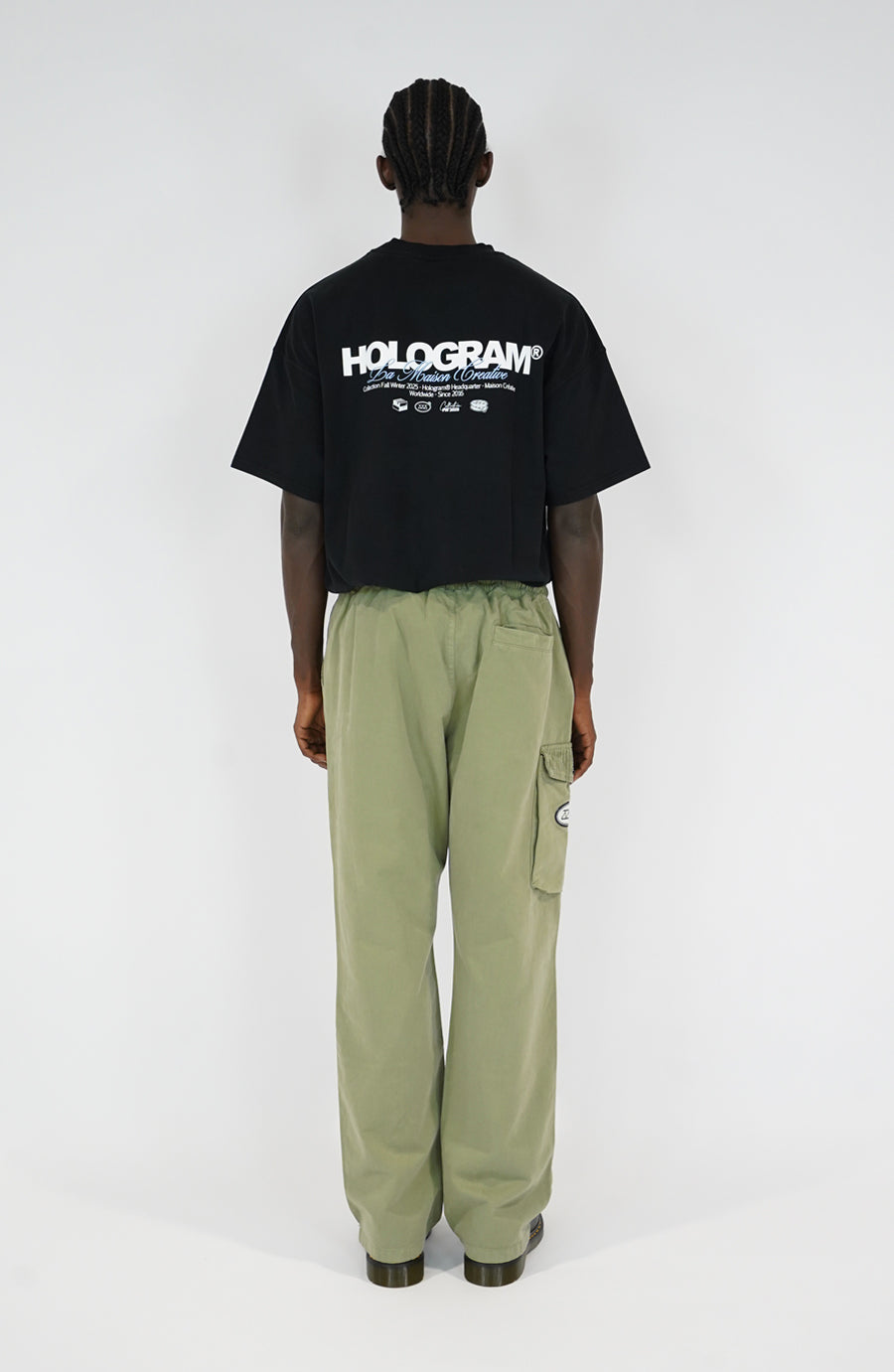 Il se distingue par sa poche cargo sur la cuisse droite, ornée d’un rabat en velours qui fait écho au col de la veste associée. Sur cette poche, un patch blanc du logo HOLOGRAM cousu signe son identité avec caractère.